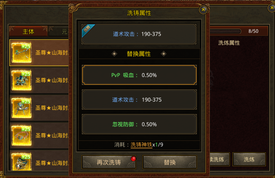 【洗铸介绍】: 1、属性品质可通过洗铸提高,同时洗铸还可以随机属性的种类,洗铸需要消耗材料洗铸神铁,并且每次只能选择一条属性进行洗铸操作; 2、当前版本21转的装备可以获得4条属性条,快点去把装备升阶起来吧! ![]()